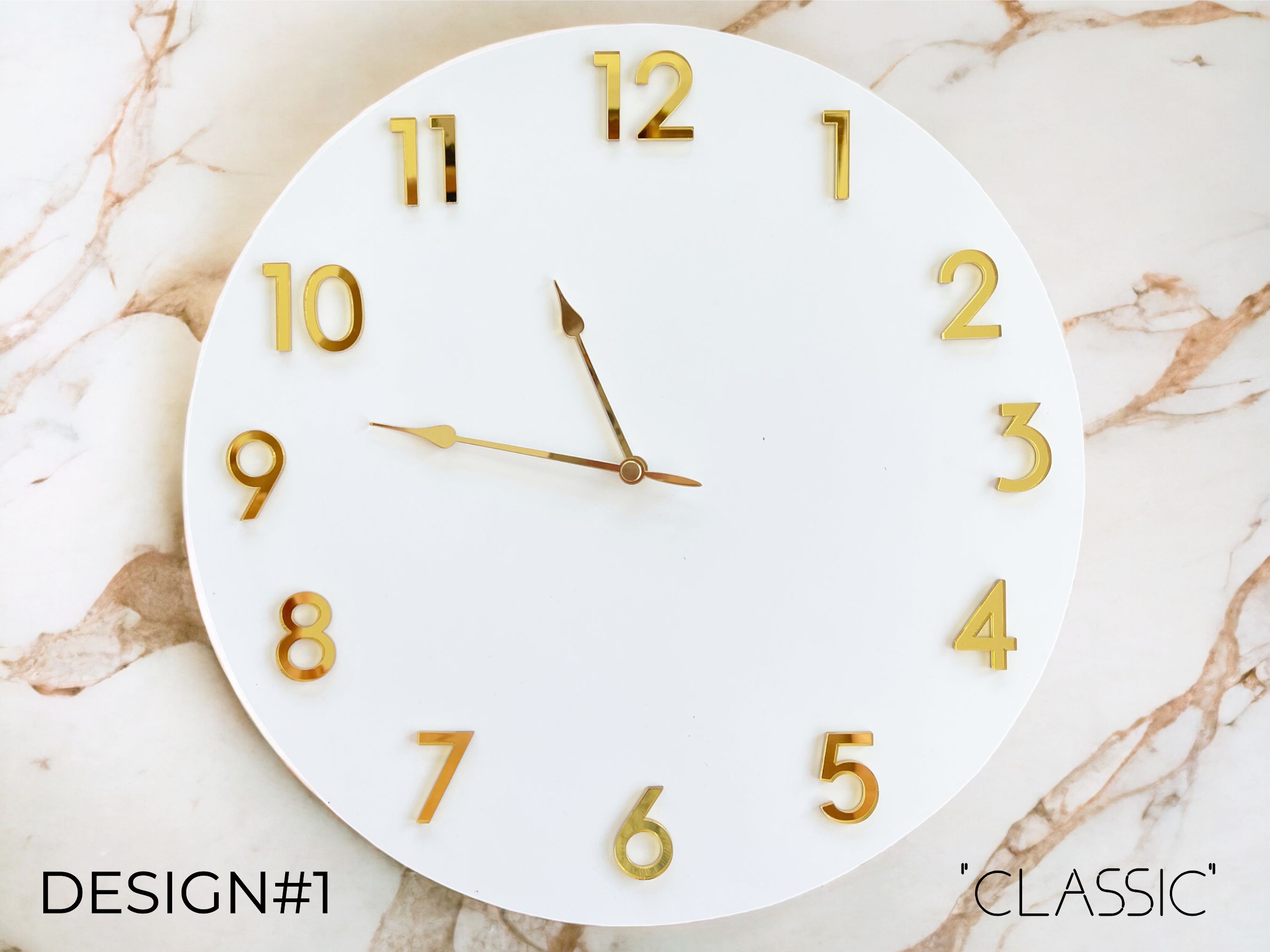 Декоративные цифры выполнены из зеркального оргстекла толщиной 3 мм — прочного, лёгкого и визуально выразительного материала. Зеркальная поверхность красиво отражает свет, создавая эффект глубины и придавая готовым часам современный, стильный вид.