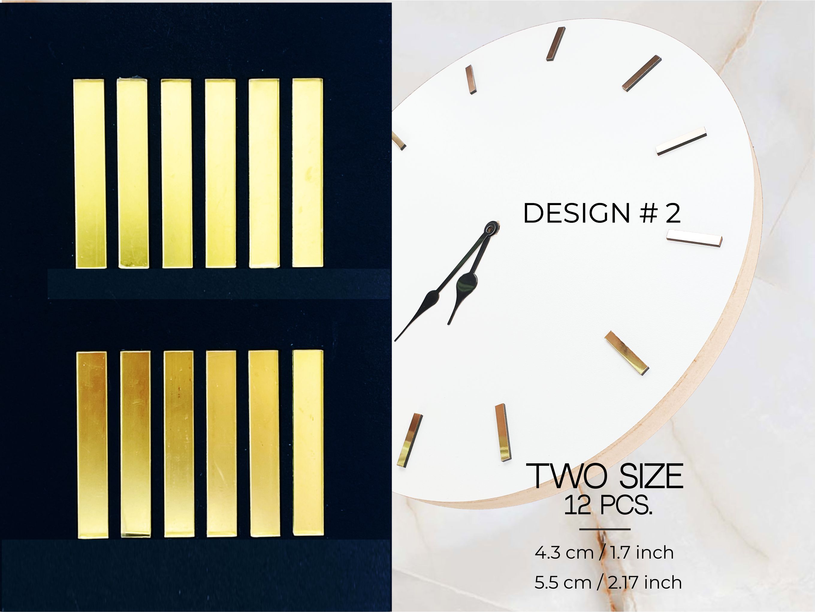 Декоративные деления выполнены из зеркального оргстекла толщиной 3 мм — прочного, лёгкого и визуально выразительного материала. Зеркальная поверхность красиво отражает свет, создавая эффект глубины и придавая готовым часам современный, стильный вид.