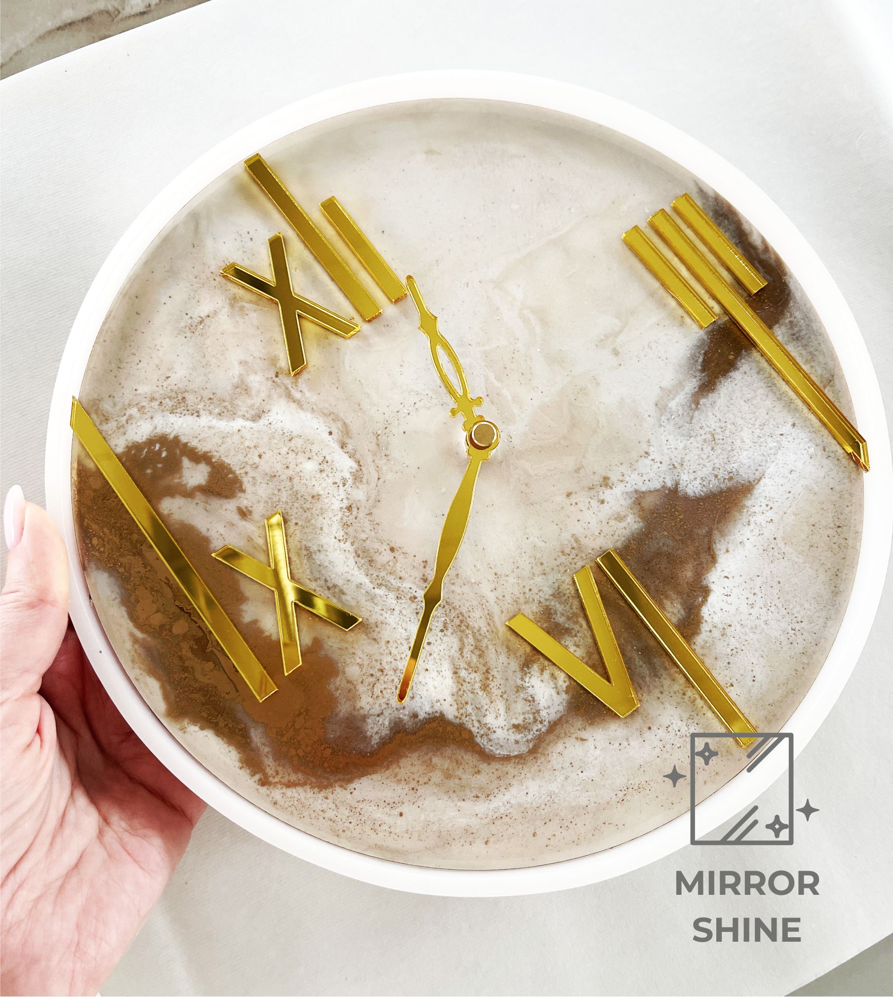 Декоративные цифры выполнены из зеркального оргстекла толщиной 3 мм — прочного, лёгкого и визуально выразительного материала. Зеркальная поверхность красиво отражает свет, создавая эффект глубины и придавая готовым часам современный, стильный вид.